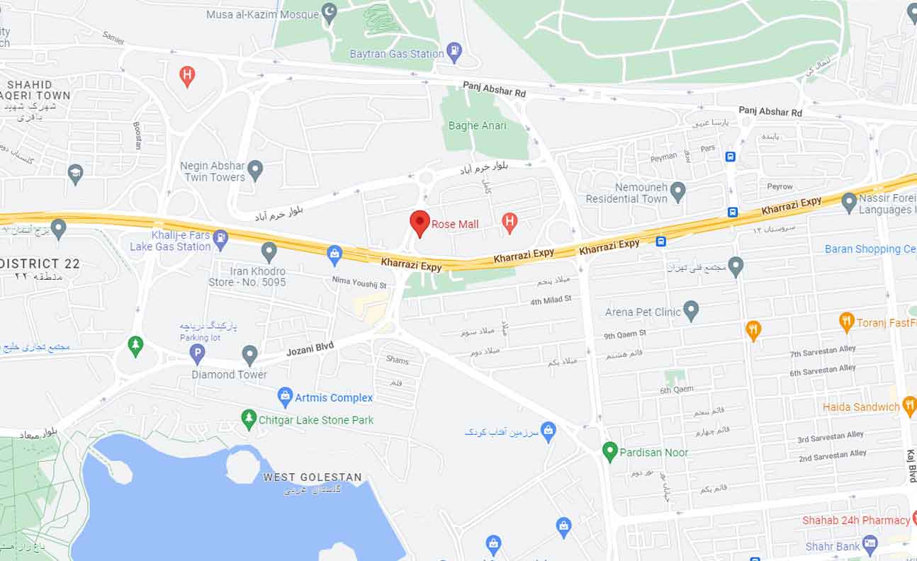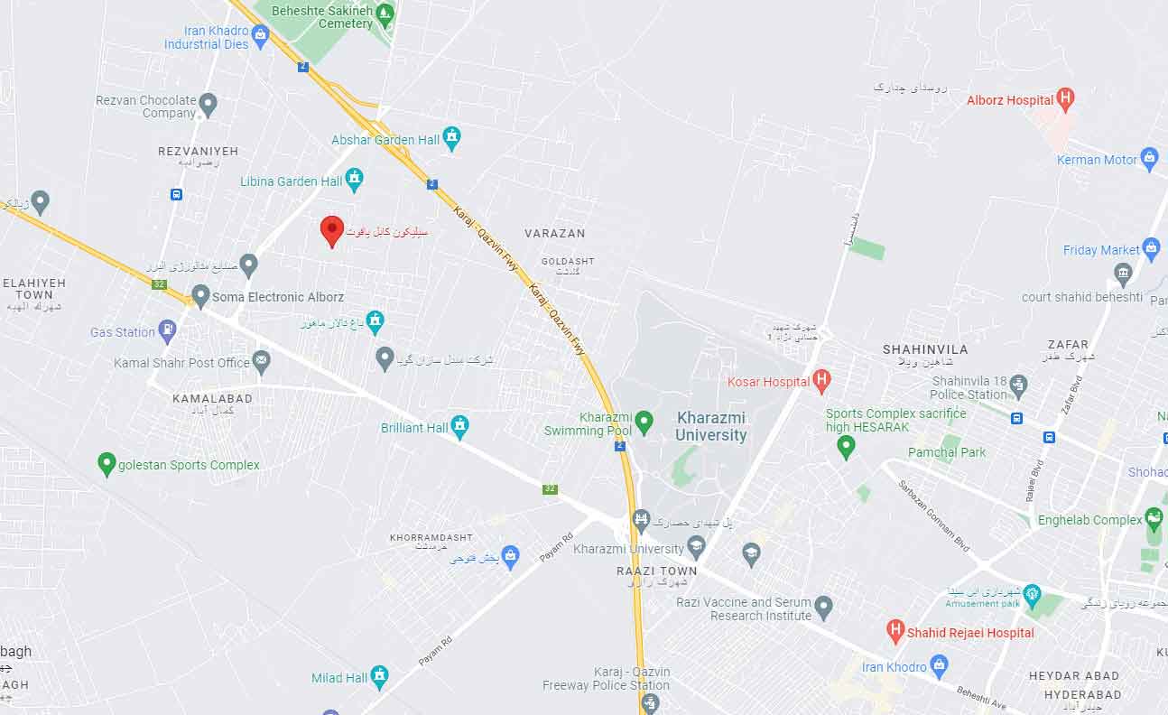 تماس با ما آدرس کارخانه : البرز، کمالشهر، خیابان شهید بهشتی، خیابان ظفر12، کوچه ششم غربی(شهید امین روستایی) پلاک های ۲۵۷ - ۲۵۶ - ۲۵۵ - ۲۵۴ تلفن : ۱۳-۰۲۶۳۴۷۱۷۷۱۲ آدرس : تهران ،چیتگر ،ساختمان رز مال ،درب جنوبی واحد 206 تلفن : ۰۲۱۴۰۴۴۴۵۰۰